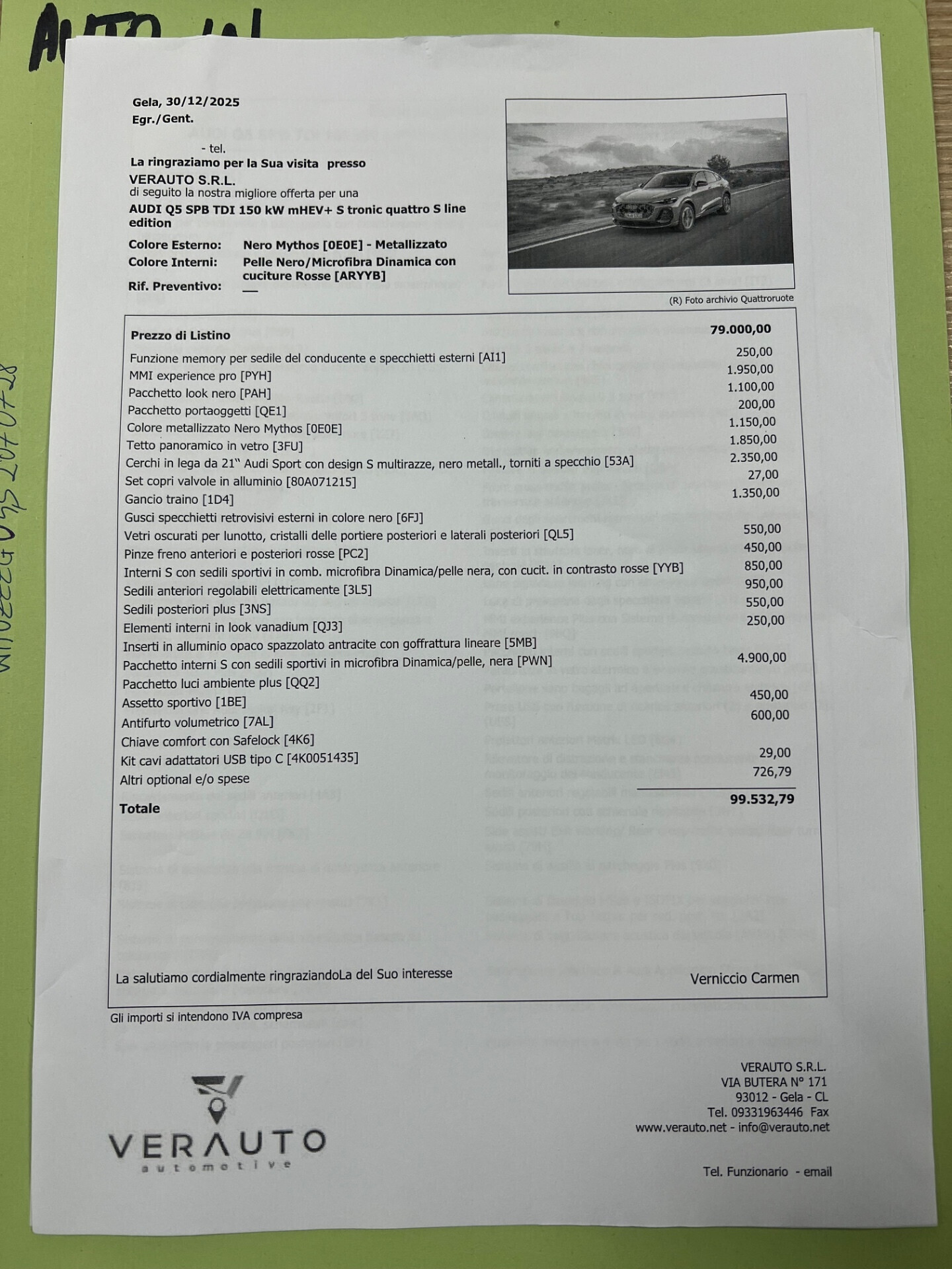 Audi Q5 SPB TDi 150 kW mHEV+ S tronic Quattro S line edition – Nuova,pronta consegna – Prezzo di listino €99.532 – Prezzo scontato €88.900 – possibilità di finanziamento, leasing inoltre proponiamo noleggio no scoring con riscatto finale Anticipo €26.400i.c – in 23 mesi canone mensile €2.512i.c,riscatto finale €24.327i.c – in 36 mesi canone mensile €2.043i.c,riscatto finale €20.827i.c – in 48 mesi rata mensile €1.825i.c,riscatto finale €16.083i.c – compreso bollo e assicurazione incendio e furto ed eventi naturali – società di nuova costituzione – persone fisiche – senza richiesta di garanzie creditizie