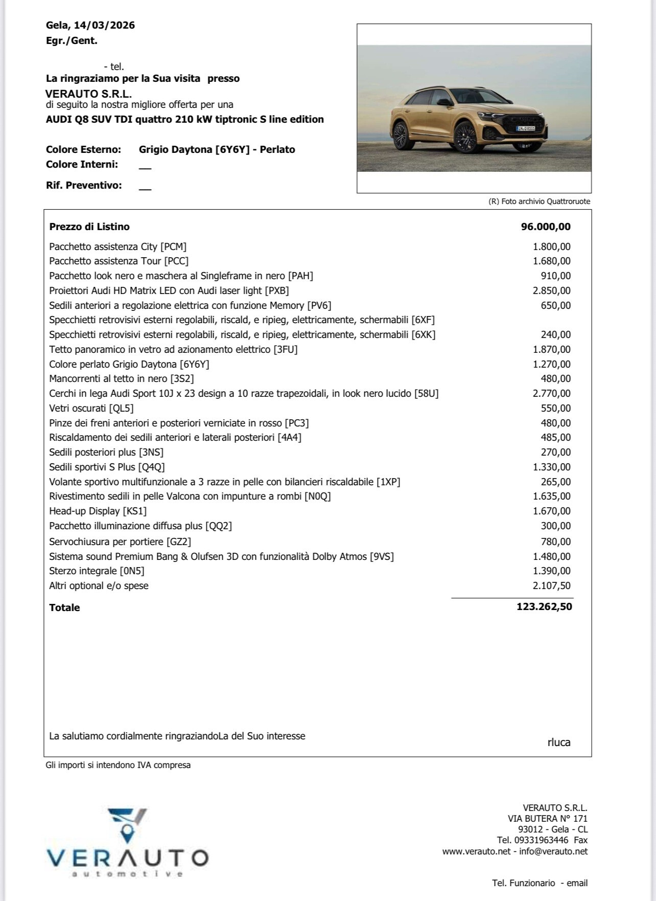 | Versione | Q8 SUV TDI quattro 210 kW tiptronic S line edition |