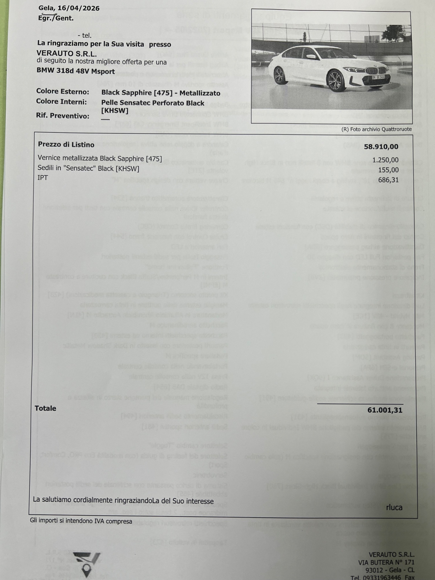 BMW 318d mhev 48V MSport – Nuova Km0 03/2026 – Listino €61.000 – Scontata €47.400 – IVA Esposta – possibilità finanziamento, leasing, inoltre proponiamo noleggio con riscatto finale con anticipo pari al 30%, no scoring senza credenziali bancarie e anche a chi ha avuto problemi al crif