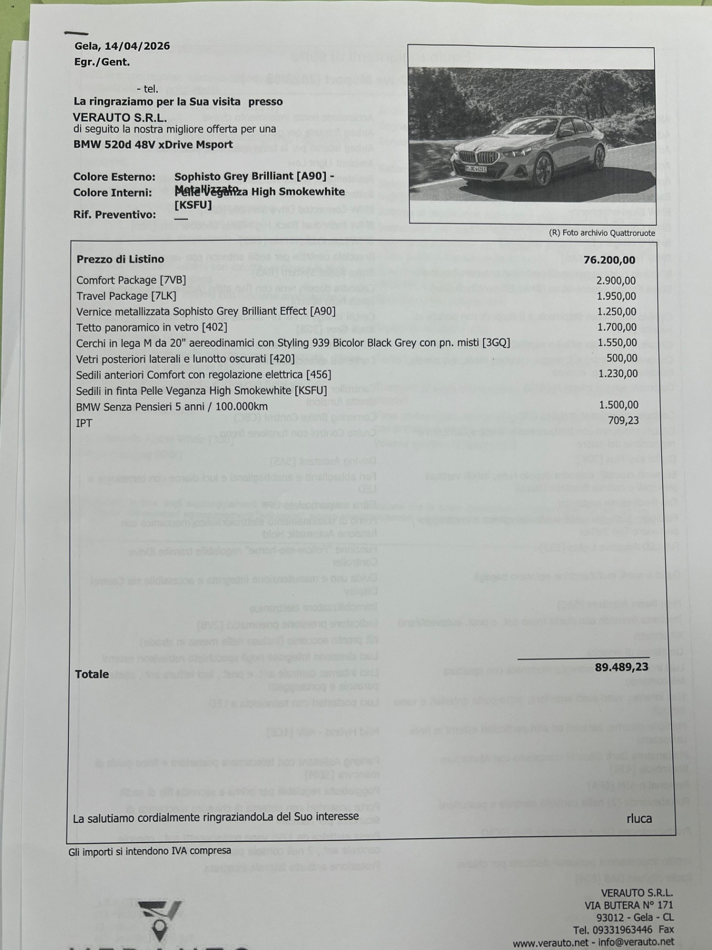 BMW 520d 48V xDrive Msport – Nuova 2026 da Immatricolare – Listino €89.489 – Scontata €77.900 – IVA Esposta – possibilità finanziamento, leasing, inoltre proponiamo noleggio con riscatto finale con anticipo pari al 30%, no scoring senza credenziali bancarie e anche a chi avuto problemi al crif