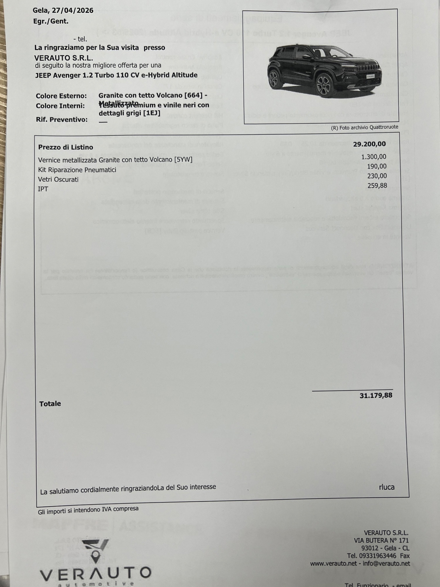 Jeep Avenger 1.2 turbo e-hybrid Altitude 110cv edct6 – Nuova Pronta Consegna – Listino €31.179 – Scontata €26.900 – IVA Esposta – possibilità finanziamento, leasing, inoltre proponiamo noleggio con riscatto finale con anticipo pari al 30%, no scoring senza credenziali bancarie e anche a chi avuto problemi al crif