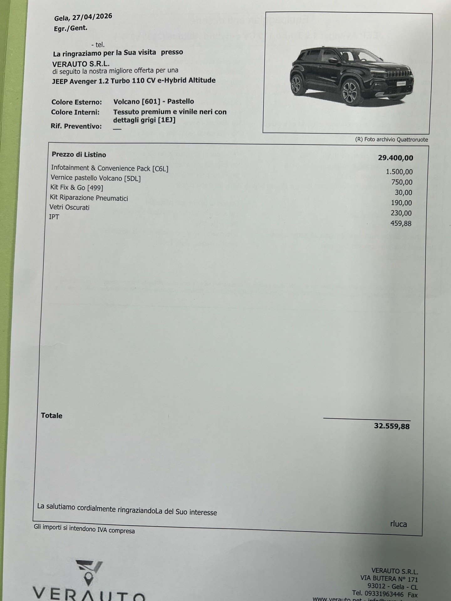 Jeep Avenger 1.2 turbo e-hybrid Altitude 110cv edct6 – Nuova Pronta Consegna – Listino €32.559 – Scontata €27.600 – IVA Esposta – possibilità finanziamento, leasing, inoltre proponiamo noleggio con riscatto finale con anticipo pari al 30%, no scoring senza credenziali bancarie e anche a chi avuto problemi al crif